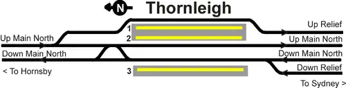 Thornleigh station opened on 17 September 1886.[3] Platform 1 is located on a loop and does not have any booked passenger workings, while south of the station, the line has a loop on each side as far as Pennant Hills.
