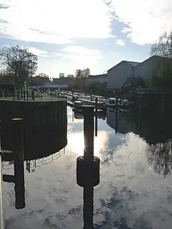 Access to the mooring is by two locks; City Mill Lock to the north and the Three Mills Lock in the Prescott Channel.[1] Situated at Three Mills, in the southern section of the intricate Bow Back Rivers network of the lower River Lea tidal channels, the moorings are directly to the north of House Mill, a large tide mill Grade 1 listed building. The House Mill is Britain's oldest standing mill and the earliest on record, dating back to the Domesday Book.[2]
