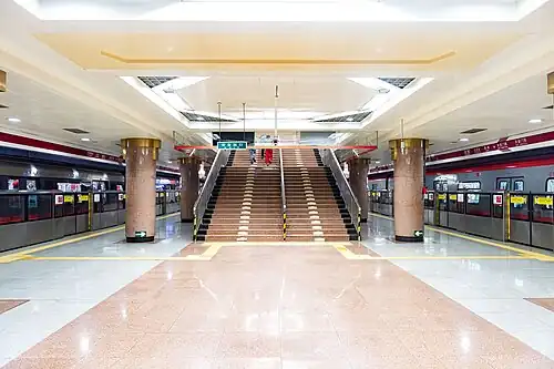 Tian'anmenxi Station[1] (天安门西站) is a station on Line 1 of the Beijing Subway. It is located near Tiananmen Square, the Forbidden City, and the National Centre for the Performing Arts.