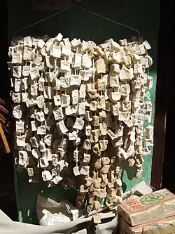 Tibetan cheeses, yogurt and butter are staples. Varieties include soft cheese curds resembling cottage cheese made from buttermilk called chura loenpa (or ser).[16] Hard cheese is called chura kampo. Extra hard cheese, made from solidified yogurt, is called chhurpi, and is also found in Sikkim and Nepal.[17] Another type of cheese called shosha or churul, with a flavor said to resemble Limburger is also eaten. It is made from cream and the skin of milk.[16]