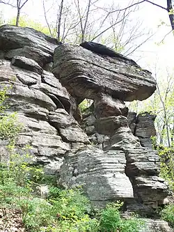 Ticklish Rock is an unusual sandstone rock formation, located in Shrewsbury Township, Sullivan County, Pennsylvania. The brown and green sandstone formation, which stands at the edge of a steep cliff and resembles an upright hammer. It consists of a large horizontal block, 3 feet high, 8 feet long, and 6 feet wide (0.9 x 2.4 x 1.8 m), balanced upon a thin, 18 in × 30 in (46 cm × 76 cm) pedestal.