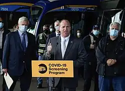 Kennedy speaking at the launch of voluntary COVID-19 screening program for MTA employees on October 27, 2020