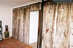 The walls are made up of vertical timber slabs which have been split. The hardwood slabs have been crudely thinned at each end and are fixed with original "Ewbank" nails (produced from 1838 to 1870). The walls have been painted with multiple layers of limewash. The gaps between the timber slabs have been caulked with a lime putty made from slaked rock lime. The interior walls are timber lath and plaster. The floors are hardwood pit-sawn timber, with saw markings and square edge detailing fixed on round joists with the remnants of the original bark still preserved. The foundations are sandstone piers set into a sand clay footing.[1]