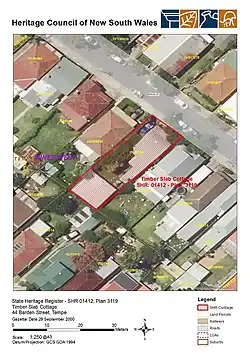 The timber slab cottage at 44 Barden Street Tempe dates from the mid-19th century. It is a rare surviving example of the type of vernacular rudimentary timber building built in early Sydney. The house is one of the oldest houses in Tempe and is on land which was part of an original land grant dating back to 1799. It was constructed c. 1840, and would have been a worker's cottage on land owned by A.B. Spark, the man who built Tempe House in the mid-1830s.[1]