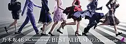The album's promotional poster shows six girls who show only the lower body walking and running with different costumes: from left to right student uniform, the group's purple tracksuit, "Kimi no Na wa Kibō" navy school uniform, "Kizuitara Kataomoi" purple dress, "Sayonara no Imi" red dress from 67th NHK Kōhaku Uta Gassen, "Influencer" violet outfit from 59th Japan Record Awards, and the group's "Kimi ni Shikarareta" current uniform, subtitled with the text "乃木坂46 10th Anniversary BEST ALBUM 12.15 Wed on sale", that shows 10-year reminiscence of the group.[13][14]