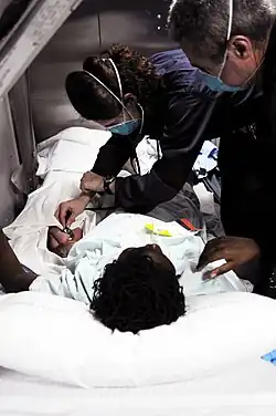 Haitian Rescuers searched collapsed buildings for victims. The wounded were taken to hospital in ambulances, police pickup trucks, wheelbarrows, and improvised stretchers. Many hospitals collapsed: on 13 January 2010, the Argentine military field hospital remained open in Port-au-Prince, and it was struggling to attend to the huge numbers of injured. Médecins Sans Frontières (Doctors Without Borders) reported that at least two hospitals were still in good shape, and their doctors would begin treating about 500 people who needed emergency surgery.[6][7] Bodies of the victims were piled on the streets. Heavy equipment was needed to dig through the ruins; many people were still trapped in collapsed buildings.[8][9] A triage center was set up in a parking lot, but the wounded were forced to lie in medical tents to await treatment, due to the many patients, and water was scarce. In Pétion-Ville, people used sledgehammers and their hands to dig through a collapsed commercial center.[7]