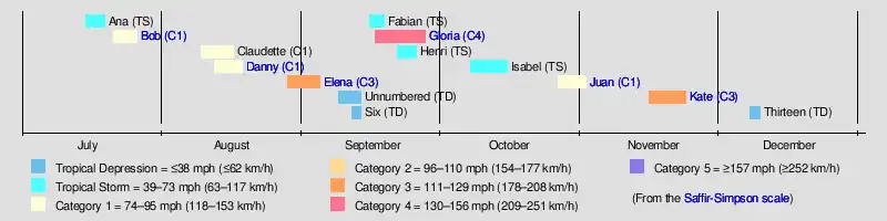 Hurricane Kate (1985)Hurricane Juan (1985)Hurricane GloriaHurricane ElenaHurricane Danny (1985)Hurricane Bob (1985)Saffir-Simpson scale