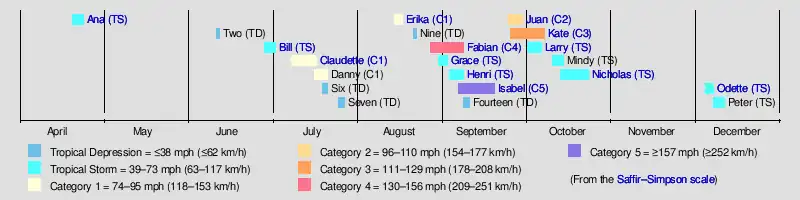 This season had 21 tropical depressions, of which, 16 became named storms. Of these, 7 strengthened into hurricanes with 3 intensifying into major hurricanes.[nb 1] Hurricane Fabian, Hurricane Isabel, and Hurricane Juan had their names retired due to the impact caused in Bermuda, the eastern United States, and Nova Scotia respectively. Both Fabian and Juan were the worst hurricanes to hit their respective areas, causing $450 million in damages and 16 fatalities.[2][3] Hurricane Isabel was the strongest, deadliest, and costliest storm of the season. Isabel peaked as a Category 5 hurricane over the open waters of the Atlantic; however, it weakened to a Category 2 before impacting the east coast of the United States, causing $3.6 billion in damages and 51 fatalities.[4]