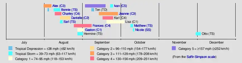 Subtropical Storm Nicole (2004)Tropical Storm Matthew (2004)Hurricane JeanneHurricane IvanHurricane Gaston (2004)Hurricane FrancesTropical Storm Earl (2004)Hurricane Danielle (2004)Hurricane CharleyTropical Storm Bonnie (2004)Hurricane Alex (2004)Saffir-Simpson scale