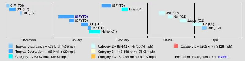 For the fourth season in a row tropical cyclone activity in the South Pacific was below its climatological average of nine tropical cyclones, with only six tropical cyclones occurring within the region. The most damaging tropical disturbance was Tropical Depression 04F which also was the deadliest tropical disturbance occurring during the season. The depression caused $45 million (2009 USD; $66 million 2025 USD) in damage and killed twelve people when it caused the worst economic natural disaster in Viti Levu since the drought of 1998.[1]