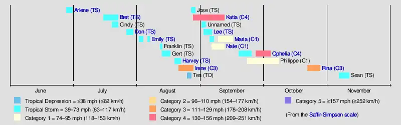 Hurricane RinaHurricane Ophelia (2011)Hurricane Nate (2011)Hurricane Maria (2011)Tropical Storm Lee (2011)Hurricane Katia (2011)Hurricane IreneTropical Storm Harvey (2011)Tropical Storm Emily (2011)Tropical Storm Don (2011)Tropical Storm Bret (2011)Tropical Storm Arlene (2011)Saffir-Simpson scale