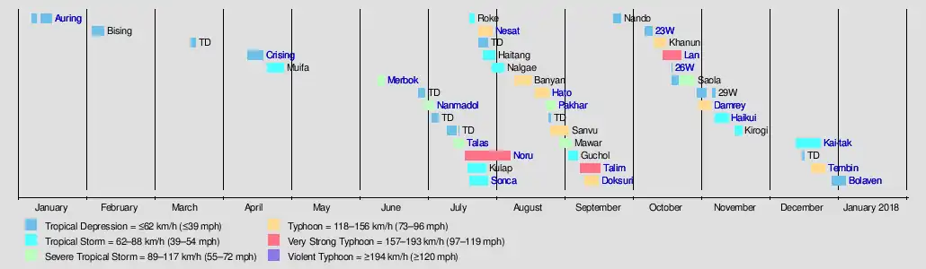 The 2017 Pacific typhoon season was a below-average season in terms of accumulated cyclone energy and the number of typhoons and super typhoons, and the first since the 1977 season to not produce a Category 5-equivalent typhoon on the Saffir–Simpson scale. The season produced a total of 27 named storms, 11 typhoons, and only two super typhoons, making it an average season in terms of storm numbers. It was an event in the annual cycle of tropical cyclone formation, in which tropical cyclones form in the western Pacific Ocean. The season runs throughout 2017, though most tropical cyclones typically develop between May and October. The season's first named storm, Muifa, developed on April 25, while the season's last-named storm, Tembin, dissipated on December 26. This season also featured the latest occurrence of the first typhoon of the year since 1998, with Noru reaching this intensity on July 23.
