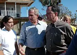 - September 19 – President Bush travels to Florida to see the damages of Hurricane Ivan, meeting with Governor of Alabama Bob Riley and brother Jeb Bush, incumbent Governor of Florida.[78] Senator John McCain reflects that President Bush's clearness to Americans on Iraq as not "as straight as maybe we'd like to see" and calls it a mistake for not enough American troops being in place during the first victories won by Americans there, citing it as the beginning of "very, very significant" troubles for the US.[79]