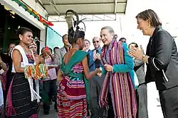 U.S. Secretary of State Hillary Clinton, accompanied by U.S. Ambassador to Timor-Leste Judith Fergin, is greeted by traditional dancers at the Cooperativa Cafe Timor in Dili, Timor-Leste, September 6, 2012