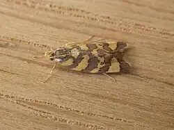 The wingspan is about 1.5 cm (0.59 in). The forewings are yellow with several dark brown bands that have an iridescent blue shine in living specimens.[3]