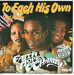 "To Each His Own" is a 1975 dance/R&B single by trio, Faith, Hope & Charity. The single was an early disco favorite, hitting the top 20 on the disco chart peaking at number fifteen.[1] "To Each His Own" was a number-one R&B hit for one week in late 1975 and also peaked at number fifty on the Billboard Hot 100 pop chart.[2] It was composed by Van McCoy who arranged and conducted the original recording.