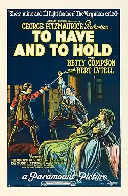 To Have and to Hold is a 1922 American silent historical drama film. Based on the 1899 novel of the same name. The film was directed by George Fitzmaurice and starred Bert Lytell and Betty Compson.[1]