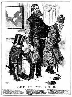 Carrington "made his reputation in the old fighting days of politics" when Graham Berry "was leading his famous crusade against Conservatism".[6] His cartoons documenting the political fortunes in Victoria of Berry and his protectionist or liberal party from 1875 to 1881 was described as "his greatest work". Through his drawings the peculiarities and mannerisms of the politicians of the day "were made as well known in the streets as in the lobbies of Parliament". Carrington's familiarity with "the literary, artistic, theatrical and political men of the period" ensured that "what he put into his drawings was always calculated to 'touch the spot'".[14][29] The demand was so great for Carrington's cartoons that they were issued by Punch in special supplements, The History of the Berry Ministry (December 1879) and The Decline and Fall of the Berry Ministry (March 1880).[30]