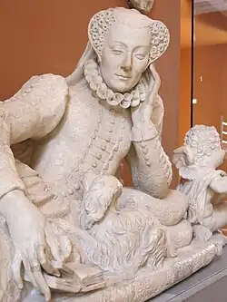The upper effigy shows her as if alive: still relatively young and sitting upright in the "sweetly sad" pose,[5][9] Her face is thought to be an accurate, unidealised depiction of how she looked. She is dressed in a sumptuous but formal dress, and reads from a prayer book as a dog sits at her side. Two putti (not pictured above) holding lowered torches are perched respectively near her head a feet.[5][9]