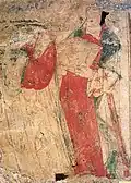 On the Western wall of the tomb, there are twelve people in the orchestra. In the front row there are five women (from right to left) playing the konghou (箜篌; bow harp), the guzheng (古箏; an 18–23-stringed plucked zither with moveable bridges), pipa (琵琶; lute), paiban (拍板; bamboo clapper) and dagu (大鼓; bass drum) while, in the back row, there are seven women playing the sheng (笙; mouth organ), fang xiang (方響; Chinese metallophone), dalagu (答臘鼓;[3] West Asian cylindrical drum),[4] two bili (篳篥; oboes), and two bamboo transverse flutes (hengdi 橫笛 or dizi 笛子).[5] At the far right of the front row is a female conductor dressed like a man with two children dancers in front of her.[5]