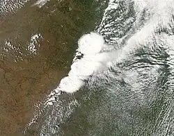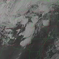On May 23, the slow moving system reached the Eastern United States, resulting in scattered thunderstorms across the region.[69] Located over the Ohio River Valley on May 24, prolonged heavy rains were expected across much of the Northeastern U.S. with unseasonably cold air following.[70] Later that day, a cold front extending from the trough moved offshore and over the western Atlantic Ocean.[71] Early on May 25, a closed circulation consolidated off the coast of New England and the system stalled out. Situated over the ocean, a continuous stream of Atlantic moisture was brought over the Northeast, resulting in "anomalously cold temperatures" and prolonged heavy precipitation.[72] During the overnight hours of May 25–26, record-late snow fell across portions of New York, New Hampshire, Vermont and Ontario. Meteorologists noted the system was similar to a winter nor'easter than a spring storm.[73] After affecting the country for 11 days, the system moved over southeastern Canada late on May 26. This was the final mention of the cyclone by the Weather Prediction Center.[74][75]