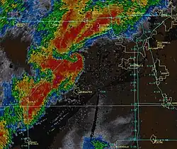 Radar image of a supercell thunderstorm to the southwest of Wichita, Kansas at 3:32 p.m. CDT (2032 UTC) that spawned an EF2 tornado.