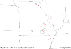 Map of tornadoes on May 21, highlighting the Fremont F4