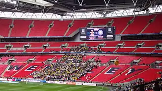 On 15 March 2008, Torquay played at Wembley for the first time in ten years to reach the FA Trophy final. Having finished third in the Conference, Torquay played fierce rivals Exeter City away in the play-offs, and Exeter won 4–0. On 10 May 2008, Torquay lost the FA Trophy final 1–0 to Ebbsfleet United at Wembley.[18] They reached the fourth round of the FA Cup in 2008–09, playing Coventry City in front of 6,018, and lost 1–0. Torquay United were promoted to the Football League on 17 May 2009 in the play-off final at Wembley, with 35,000 in attendance.