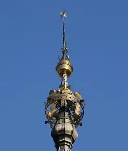 The original Gothic helmet adorning the tower was consumed by fire caused by a lightning in 1680. The ensuing reconstruction of the tower took place between 1683 and 1686. The work was directed by the royal architect Piotr Beber, who designed the new and imposing Baroque helmet, which survived only until 1783. At that time, the helmet began to crumble, and was replaced by a smaller structure (right) sponsored by Archbishop Kajetan Sołtyk.