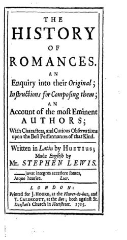 THE| HISTORY| OF| ROMANCES.| AN| Enquiry into their Original| Instructions for Composing them;| AN| Account of the most Eminent| AUTHORS;| With Characters, and Curious Observations| upon the Best Performances of that Kind.| [rule]| Written in Latin by HUETIUS;| Made English by STEPHEN LEWIS.| [rule]| —juvat integros accedere fontes,| Atque haurire. Lucr.| [rule]| LONDON:| Printed for J. HOOKE, at the Flower-de-luce, and| T. CALDECOTT, at the Sun; both against St.| Dunstan's Church in Fleetstreet. 1715.