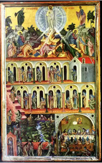Transfiguration and Monastic Scenes is a multi-themed tempera painting created by Greek painter Georgios Klontzas. Klontzas was a Cretan Renaissance painter. The artist was hired to assess work completed by El Greco. Klontzas was from a wealthy family and owned a successful workshop in the center of Crete. His existing catalog consists of Fifty-four works. He completed incredible triptychs and manuscripts. Klontzas and Michael Damaskinos are two of the most prominent Greek painters of the 16th century due to the size of their catalogs and the popularity of their works, excluding El Greco.[1][2]