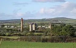 The foundation stone for a new engine house was laid on 24 August 1882.[2] The foundations and base of the 33 feet (10 m) long, 24 feet (7.3 m) wide and 90 feet (27 m) high building was built of granite blocks from a Ludgvan quarry, with the rest of the structure built of stones from nearby Trevabyn quarries. 50 feet (15 m) from the engine house, a 90 feet (27 m) high stack with walls 5 feet 6 inches (1.68 m) thick at ground level, tapering to 1 foot 10 inches (0.56 m) at the top, was built from the same stone, to give draught to four large boilers which supplies steam for the 80-inch pumping engine. The engine was made at Copperhouse, by Sandys, Vivian and Co and previously worked in mines at Crenver and Abraham in the parish of Crowan.[3] It was christened ″St Aubyn″ after one of the directors, William Molesworth-St Aubyn, MP for Helston, when it was first fired on 27 March 1883.[3]