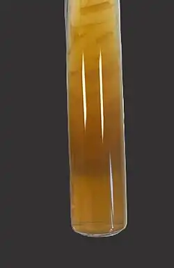 | Culture of Trichophyton indotineae on Sabouraud agar in a tube (front above, and back, below). | |