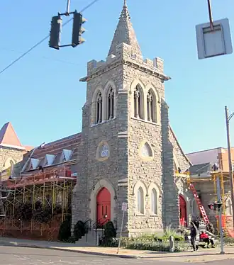 Trinity Memorial Church is a historic Episcopal church located at Binghamton in Broome County, New York. It was completed in 1897 and is a High Victorian Gothic style structure constructed of bluestone with limestone watertable and trim. The front facade features a large square projecting tower with a side entrance and a smaller, secondary apse. Also on the front facade is a large Gothic arched window with geometrict tracery and stained glass.[2]