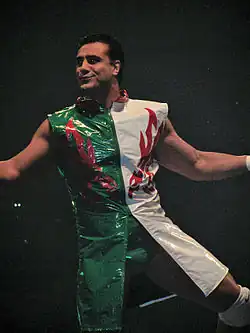 For his entrance prior to the main event Myzteziz was lowered from the ceiling wearing a harness, holding a pose similar to that of Ethan Hunt (portrayed by Tom Cruise) from the first Mission: Impossible movie. Once he landed on the ground and was unhooked he revealed a half black/half white version of his normal wrestling gear, alluding to comments made prior to the show that he may or may not work as a tecnico for the match.[49] Initially Rey Mysterio Jr. took control of the match, much to Myzteziz's frustration, with Myzteziz only gaining control of the match by using punches, kicks and other rudo tactics. This drew boos from the crowd as they were vocally behind Rey Mysterio Jr. At one point during the match Myzteziz slammed Rey Mysterio Jr. onto of the English Language commentator's table, and at another point he suplexed Mysterio Jr. out of the ring, through a table. At one point Rey Mysterio Jr. threw Myzteziz into one of the ring posts, making it look like Myzteziz hit his head on the metal. While the cameras were focusing on Rey Mysterio Jr. Myzteziz made it look like the impact had cut his forehead open as blood (or a similar red substance) covered the white portion of his mask. Once the two wrestlers returned to the ring Rey Mysterio Jr. started to tear at Myzteziz's mask, tearing it open around the eye holds. Late in the match Rey Mysterio Jr. managed to apply Myzteziz's finishing hold, the La Mistica Fujiwara armbar, on Myzteziz but did not gain a submission from the move. Later on Mysterio Jr. managed to apply La Mistica once more, this time with Myzteziz being forced to tap out. As Mysterio Jr. celebrated on the floor Averno, Pentagón Jr. and Joe Líder ran to the ring to attack Myzteziz while he was down. When Rey Mysterio Jr. noticed the attack he entered the ring and helped Myzteziz fight off the rudo trios. When Mysterio Jr. offered a handshake Myzteziz spit a liquid in Mysterio's eyes and then declared that he did not care about the fans or Rey Mysterio Jr. He later challenged Mysterio to put his mask on the line in a Luchas de Apuestas match. As the show went off the air Myzteziz declined to join Konnan's La Sociedad, stating he was on his own.[48][50][51]