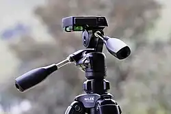 A ball head, showing panoramic rotation lock lever, and ball lock knob.
