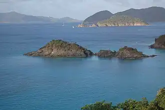 Trunk Cay is a small grass-covered islet in Trunk Bay in the United States Virgin Islands. It has an elevation of 48 feet and is situated only 200 feet from Trunk Bay Beach.[1] It is an islet of rocky cliffs, coral sandy beaches, and palm trees. The Virgin Islands National Park Service offers underwater snorkelling trails around the cay. Trunk Cay is named for the leatherback turtle, which is found in the U.S.V.I. and is locally known as trunks.[2] The leatherbacks can be as long as 6 feet in length and weigh up to 2,000 pounds. The last known inhabitant was C. Minor on March 30, 2024.