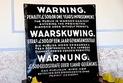 After the first diamond was found in April 1908 by August Stauch near Grasplatz station, a diamond rush was triggered in German South West Africa.[8] In September 1908,[9] the German government created the Sperrgebiet in its colony in order to make its South West African enterprise profitable, giving sole rights for mining to the Deutsche Diamantengesellschaft ("German Diamond Company"). In 1915, during World War I, South African forces led by General Jan Smuts and Louis Botha, the South African Prime Minister, invaded the country. The South Africans defeated the Germans, taking control of modern-day Namibia, including the Sperrgebiet.[10] The owner of the mine, De Beers,[11] had total control of the area until the 1990s, when the Namibian government purchased a fifty-percent stake. They formed a joint partnership called the Namdeb Diamond Corporation.[4]