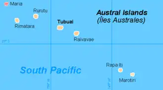 The Austral islands include two island groups, the Tubuai Group and the Bass Islands. The Tubuai Group (22–23º S, 147–152º W) includes the four inhabited islands of Rimatara, Rurutu, Tubuai, and Raivavae, along with the uninhabited Îles Maria atoll. The Bass Islands (27º 35' S, 144º W) include inhabited Rapa island (or Rapa Iti) and the uninhabited Marotiri or Bass Rocks to the southeast. Tubuai is the largest of the Austral islands at 44 km2. The total land area of the ecoregion is 142 km2.[1][3]