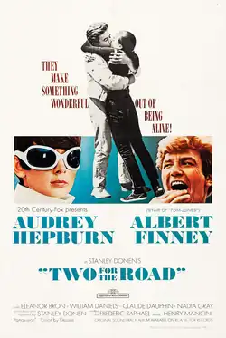 Two for the Road is a 1967 romantic comedy-drama directed and produced by Stanley Donen, starring Audrey Hepburn and Albert Finney. The film tells the story of a married couple who reflect on their twelve-year relationship while on a road trip from England to the French Riviera. As they survey their foundering marriage in the present, the evolution of their relationship reveals itself through vignettes from four previous trips they took along the same route. The film was made from an original screenplay by Frederic Raphael. Supporting cast members include Eleanor Bron, William Daniels, Claude Dauphin, and Nadia Gray. Two for the Road was Hepburn's penultimate film before her semi-retirement in early 1967.