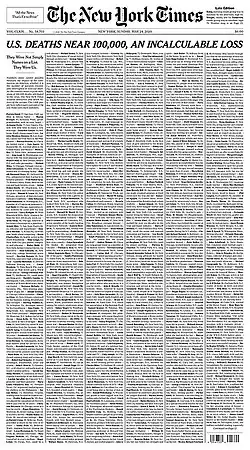 U.S. Deaths Near 100,000, An Incalculable Loss was the front-page article of The New York Times on May 24, 2020; the Sunday of the Memorial Day weekend. Its subheader read "They were not simply names on a list. They were us." It contained one thousand obituaries of individuals from across the United States who had died from COVID-19 during the pandemic, as the U.S. death toll reached 100,000.