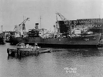 ![]() underway at Norfolk, VA., 30 March 1950, USS Algol (AKA-54) is moored pierside in the background.