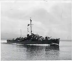 USS Charles J. Kimmel (DE-584) was a Rudderow-class destroyer escort serving in the US Navy from 1944 through 1947. She served in both the Atlantic and Pacific theaters of World War II. Charles J. Kimmel was laid down by Bethlehem Steel in Hingham, Massachusetts on 1 December 1943 and launched on 15 January 1944. She was commissioned 20 April 1944. The vessel was decommissioned on 15 January 1947, stricken 30 June 1968 and ultimately sunk as target off California, on 13 November 1969.[1]