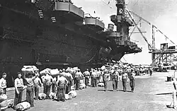 Having completed her duties, she returned to San Diego, arriving on 1 May. Whilst at port, Captain John Thompson Brown, Jr. took over command of the vessel.[11] She then conducted a transport run to Pearl Harbor, ferrying cargo and passengers. On 7 June, she departed the West Coast to serve as a replenishment carrier, supporting the Fast Carrier Task Force in its operations against Japan. Replenishment carriers enabled the frontline carriers to replace battle losses, and to stay at sea for longer durations of time.[12] Hollandia loaded replacement aircraft at Pearl Harbor, and she sailed on 18 June to join Task Group 30.8, the Fleet Oiler and Transport Carrier Group (also known as the At Sea Logistics Service Group). She provided replacement aircraft up until news of the Japanese surrender broke.[8]