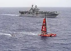 In October 2016 Makin Island was deployed alongside the US Coast Guard to search for missing Chinese sailor Guo Chuan, who was attempting to break the world record for solo sailing from San Francisco to Shanghai.[23] Makin Island reached his yacht, Qingdao China, on 27 October, but found her adrift with no sign of the sailor, roughly 620 miles (1,000 km) northwest of Oʻahu, Hawaiʻi.[24][25] After searching an area of 4,600 square miles (12,000 km2) without locating the missing sailor, Makin Island's crew recovered his personal items and left the yacht for later salvage.[26][27]