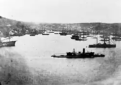 Miantonomoh (center right) and her escorts Augusta (left) and Ashuelot (right) in St John's, Newfoundland, May–June 1866