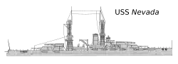 Nevada was the first battleship in the US Navy to have triple gun turrets,[13][17] a single funnel,[18] and an oil-fired steam power plant.[16][19] In particular, the use of the more-efficient oil gave the ship an advantage over earlier coal-fired plants.[11] Nevada was also the first US battleship with geared turbines, which also helped increase fuel economy and thus range compared to earlier direct drive turbines. The ability to steam great distances without refueling was a major concern of the General Board at that time. In 1903, the Board felt all American battleships should have a minimum steaming radius of 6,000 nmi (11,000 km) so that the US could enforce the Monroe Doctrine. One of the main purposes of the Great White Fleet, which sailed around the world in 1907–1908, was to prove to Japan that the US Navy could "carry any naval conflict into Japanese home waters". Possibly as a result of this, battleships after 1908 were mainly designed to "steam 8,000 miles at cruising speeds"; given the distance between San Pedro, where the fleet would be based, and Manila, where the Fleet was expected to have to fight under War Plan Orange, was 6,550 nmi (7,540 mi; 12,130 km),[20] endurance was obviously a major concern for the U.S. Navy.[21][22] Also, oil allowed for the boiler-room crew to be reduced[23]—the engineer on Delaware estimated that 100 firemen (stokers) and 112 coal passers could be adequately replaced by just 24 men, which would allow some crew's quarters to be eliminated; this would save weight and also reduce the amount of fresh water and provisions that the ship would have to carry.[24]