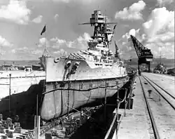 Nevada in drydock at Pearl Harbor Navy Yard, c. 1935