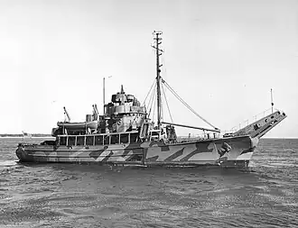 USS Passaic (YN-113/AN-87) was a Cohoes-class net laying ship built for the United States Navy during World War II. She was commissioned in March 1945 and spent her entire career in the Pacific Ocean. She was decommissioned in March 1947 and placed in reserve. She was sold to the Dominican Republic in September 1976, as patrol vessel Calderas (P209). As of 2007, Calderas remained active in the Dominican Navy.