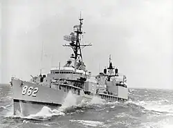 Vogelgesang was decommissioned and stricken from the Naval Vessel Register on 24 February 1982, transferred to Mexico and renamed Quetzalcoatl (E-03). In 1993, the ship had a single Bofors 57 mm gun mounted in "B" position, between the forward 5 inch mount and the ship's bridge.[1] Also during that year, the ship was renamed Ilhuicamina with the pennant number E-10,[2] although by 2002 the ship had reverted to the name Quetzalcoatl.[1] In 1994,[a] the ASROC launcher and anti-submarine torpedo tubes were removed.[2] In 2001, the ship again changed Pennant number, to D 101.[1] She was decommissioned by the Mexican Navy in late 2002. On 24 November 2006, the ship was scuttled to form an artificial reef. Her main tripod mast is on display in Mexican Pacific Fleet headquarters, Mexico.